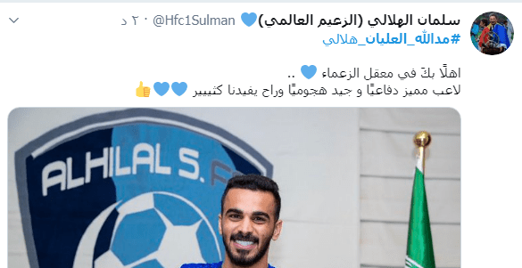 أعلن الهلال رسميًا تعاقده مع مدالله عليان مدافع التعاون عبر تغريدة نشرها على حسابه الرسمي في تويتر، وقد أتبعها النادي بعدة تغريدات حملت .